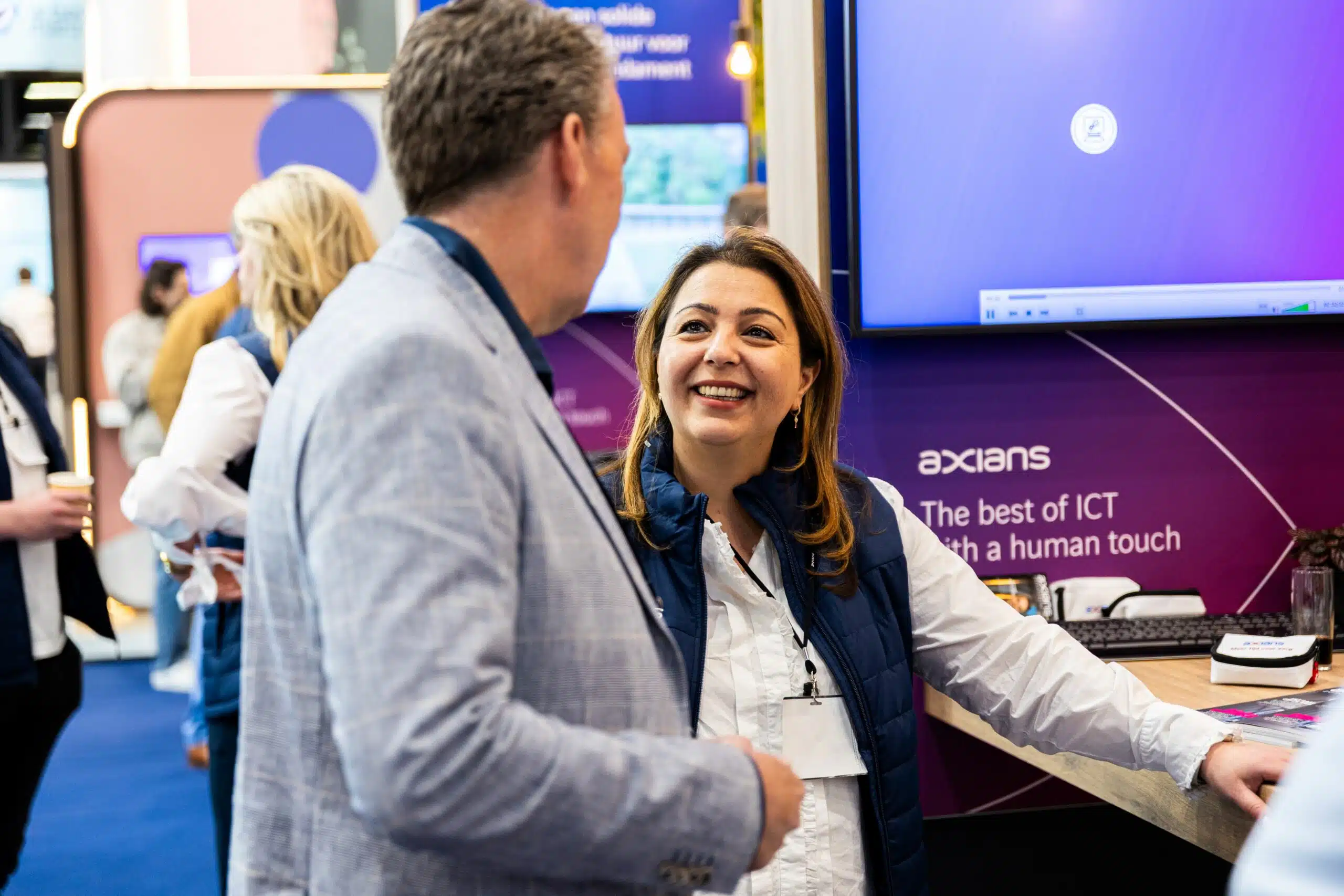 Voor Axians stond de onlangs gehouden Zorg & ICT-beurs nadrukkelijk in het teken van ‘meer tijd voor zorg’. Met een zorgpaviljoen als stand, een eigen zorgmagazine en goedbezochte kennissessies werd niet alleen zichtbaar gemaakt wat technologisch mogelijk is, maar vooral hoe ICT bijdraagt aan werkgeluk, efficiëntie en betere zorg. Want daar draait het om, zo vertellen Directeur Zorg André Hendriks en Marketing Manager Sebnem Unal.
