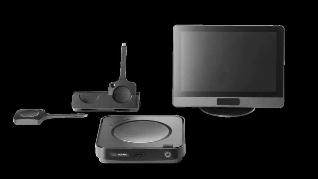 ClickShare Hub Pro: Uitgebreide variant met ondersteuning voor twee schermen, twee Buttons en extra connectiviteitsopties voor complexere setups.