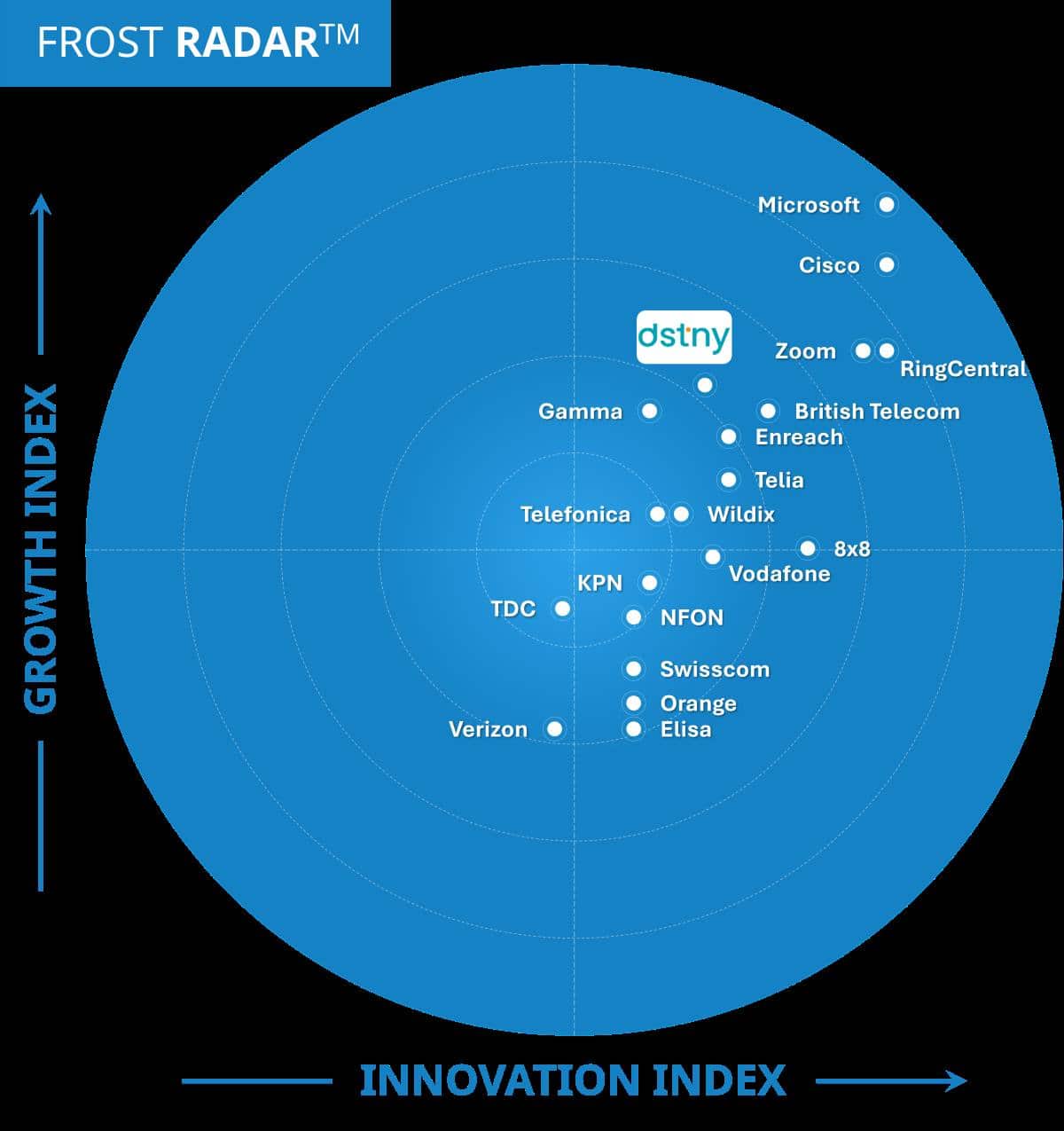 Dstny, een toonaangevende Europese aanbieder van cloudgebaseerde zakelijke communicatie, heeft opnieuw een toppositie behaald op de Frost & Sullivan UCaaS Frost Radar™ 2024. Dit is het vierde opeenvolgende jaar dat Dstny door Frost & Sullivan wordt erkend voor zijn voortdurende innovatie, strategische groei en toewijding aan het leveren van kwalitatieve UCaaS-oplossingen (Unified Communications as a Service).