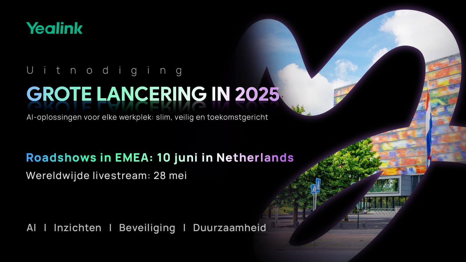 Yealink luidt de zomer in met een wereldwijde introductie van geavanceerde AI-oplossingen voor de moderne werkplek. Onder de noemer ‘Grote Lancering in 2025’ organiseert de fabrikant een internationale livestream op 28 mei, gevolgd door een reeks roadshows in EMEA. De Nederlandse editie vindt plaats op 10 juni in het iconische Beeld & Geluid in Hilversum.