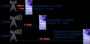 Maar om op de vraag terug te komen: op de 3,5 GHz band wordt het mogelijk om 1 – 2 Gbit/s aan downloadsnelheid te halen, zie ook afbeelding 2 met de verschillende afstanden en snelheden.